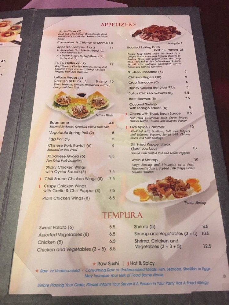 Beef skewers, chicken skewers, spring rolls, chicken wings, coconut shrimp, chicken fingers, and crab rangoons.